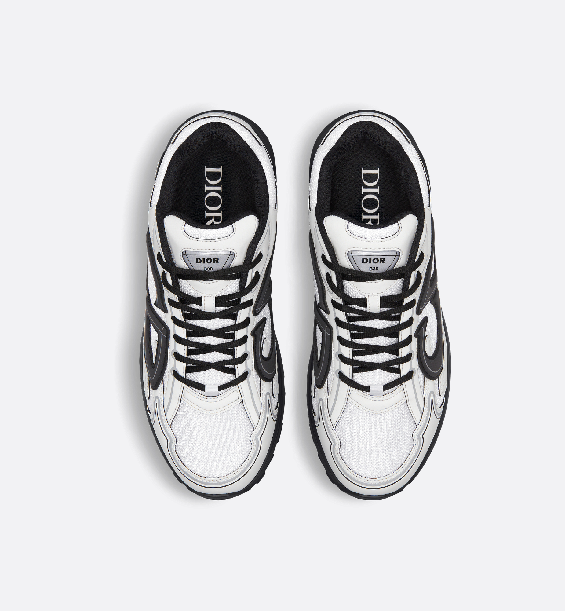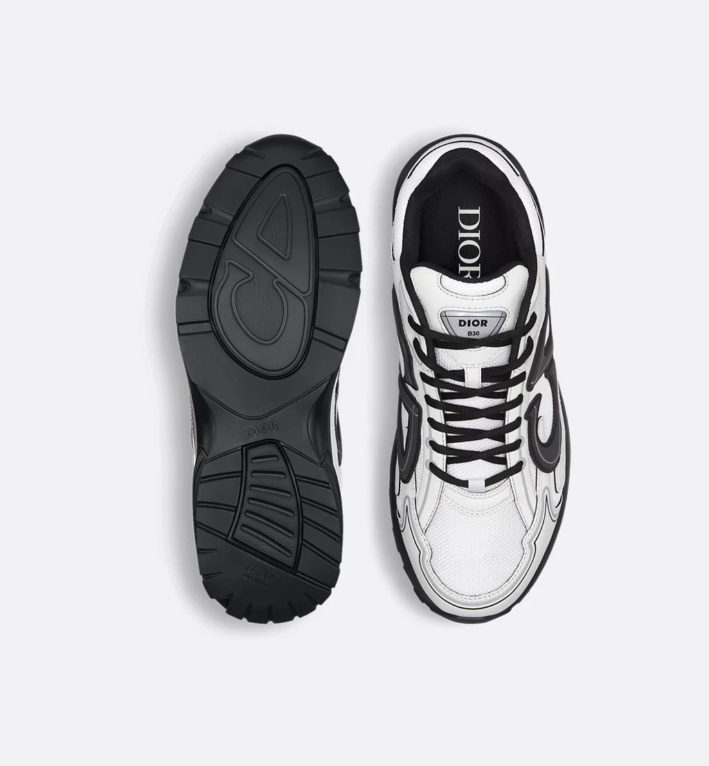 The B30 Countdown sneaker is a new House essential, distinguished by its modern and sporty low-top silhouette. Crafted in white technical mesh and white technical fabric, it is enhanced by a reflective black CD30 signature with a graphic aesthetic. The B30 Countdown also features silver-tone Dior B30 and CD30 signatures on the tongue and back. A sculpted and ultralightweight rubber sole spotlights various hallmark details, while elastic on the interior provides optimal comfort. The B30 Countdown sneaker will complete any casual outfit.